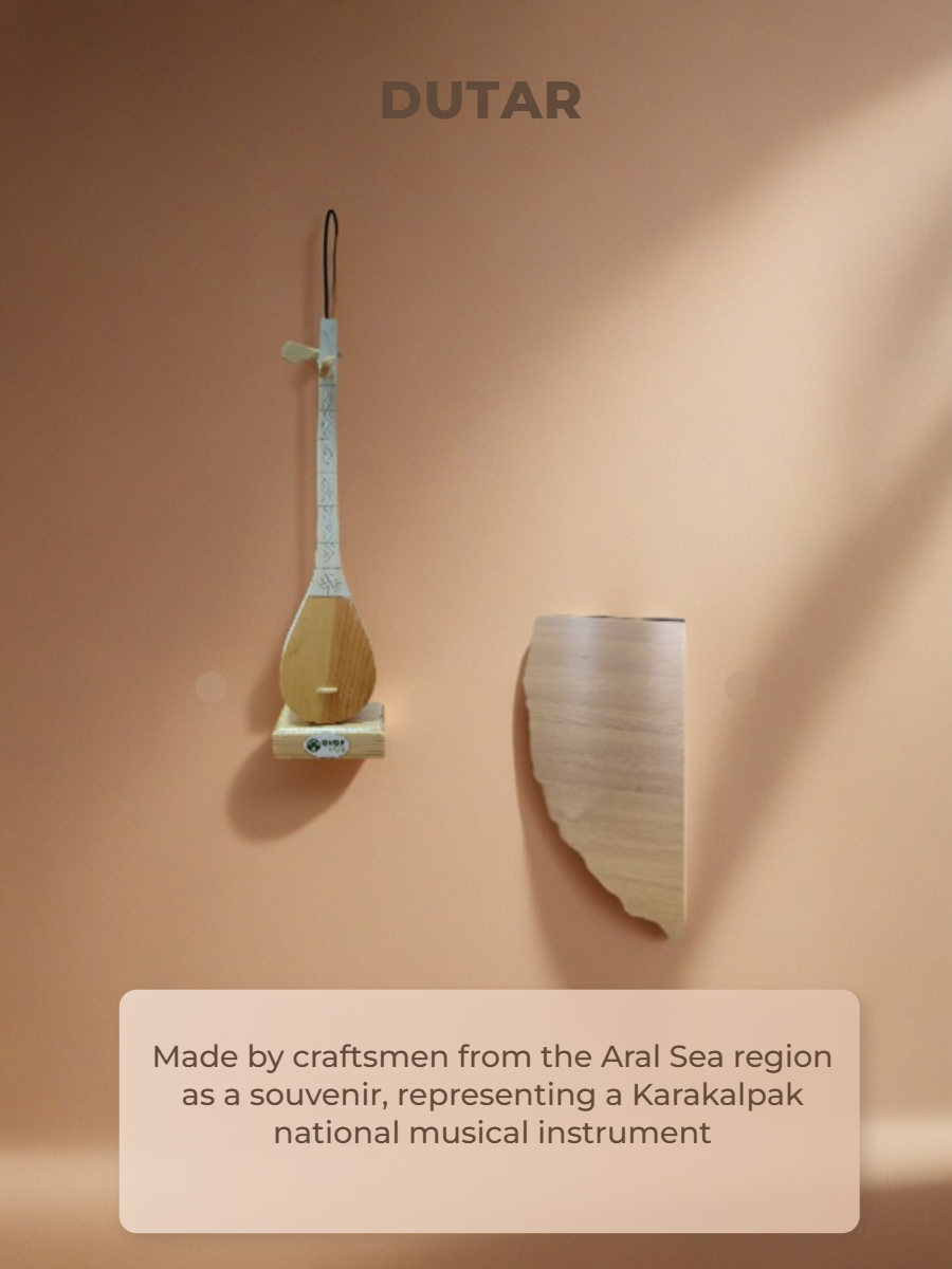 This product is specially made by the masters of crafts of the Aral Sea region as a souvenir gift of the original Karakalpak national musical instrument “Dutar”. The dutar has two strings made and Its name comes from the Persian word for “two strings”, دوتار do tār. To this day some instruments still feature silk strings, although nylon or steel strings are also commonly used. The dutar has a warm, dulcet tone. Typical sizes for the pear-shaped instrument range from one to two meters.